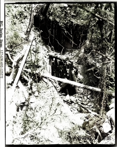 A side-entrance into Admiral Ota's cave after phosphorous grenades had been thrown in. Note the logs jutting out of the entrance. These had been used to buttress the entrance. This cave was impregnable to any to any sort of bombardment and had to be taken by infantry.【訳】白燐弾が投げ込まれた後の大田中将の壕の通用口。入り口から突き出た丸太に注目。これらは入り口の補強に使われていた。この壕はどんな砲撃にもゆるがず、攻略するには歩兵を投入しなければならなかった。