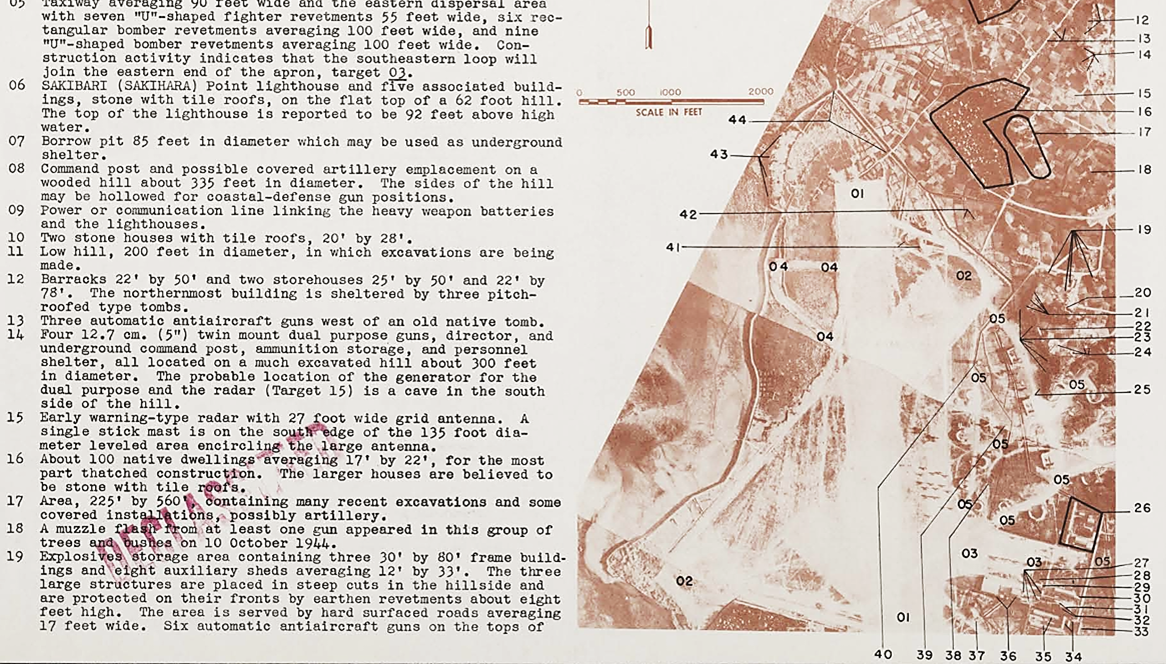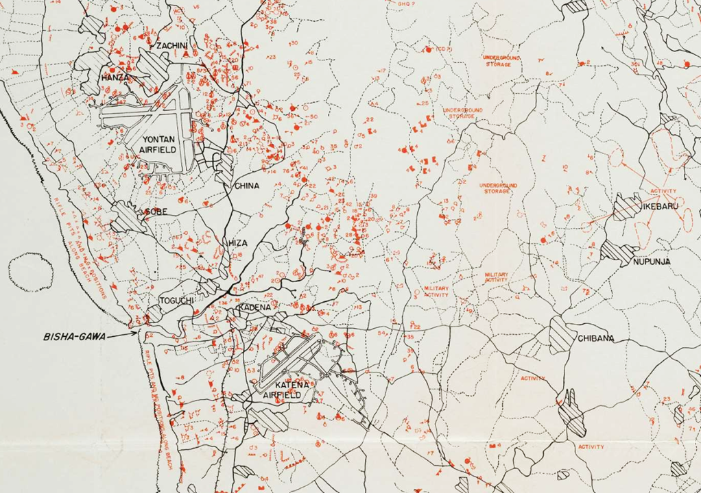 (下図) 上陸地点の詳細な解析の一例 (1945年2月28日付)。米軍は十・十空襲で撮影した膨大な空中写真などを解析し、例えば上陸目標となる読谷と嘉手納の飛行場周辺だけではなく、艦砲射撃のなか県立農林学校の学徒が食糧を運ばされた倉敷・御殿敷の地下壕 (読谷飛行場と池原の中間地点)*1の「地下貯蔵施設」(underground storage) まで記している。また日本が同化政策で沖縄人に日本語読みを強要したのに対し、米軍は琉球語の読み方、例えば「登川」(のぼりかわ) を Nupunja (にぃぶんじゃー)、「波平」(なみひら) を Hanza と記載している事にも注目*2 。