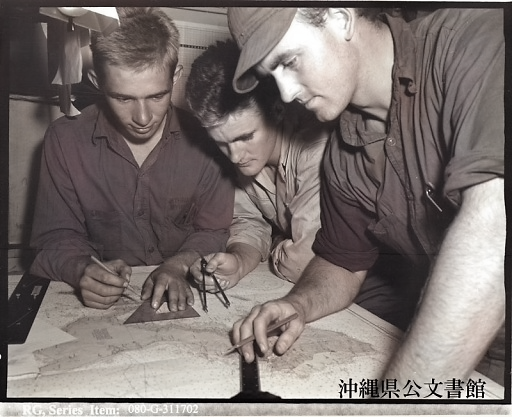上陸地点 (読谷・嘉手納) の作戦地図に見入る揚陸艇の乗組員。