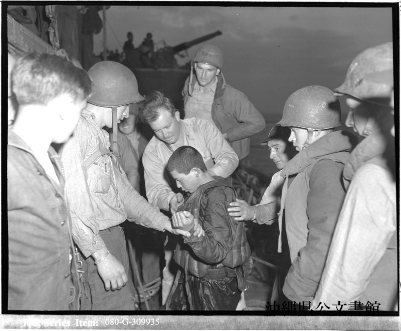 Jap flier, knocked down by planes of US carrier task force at Okinawa, L-day, is picked up by US destroyers. He was one of nine. The others swam away as ship approached. Exec. Officer of ship searching him for weapons. 上陸日、米空母機動部隊の戦闘機に撃墜され、米駆逐艦により救出された日本軍操縦士。この日本軍操縦士は、海に投げ出された日本兵9人の中の1人。他の日本兵は、駆逐艦が近づくと、泳いで逃げた。武器を持っていないか体をさぐる副艦長。(1945年4月1日撮影)