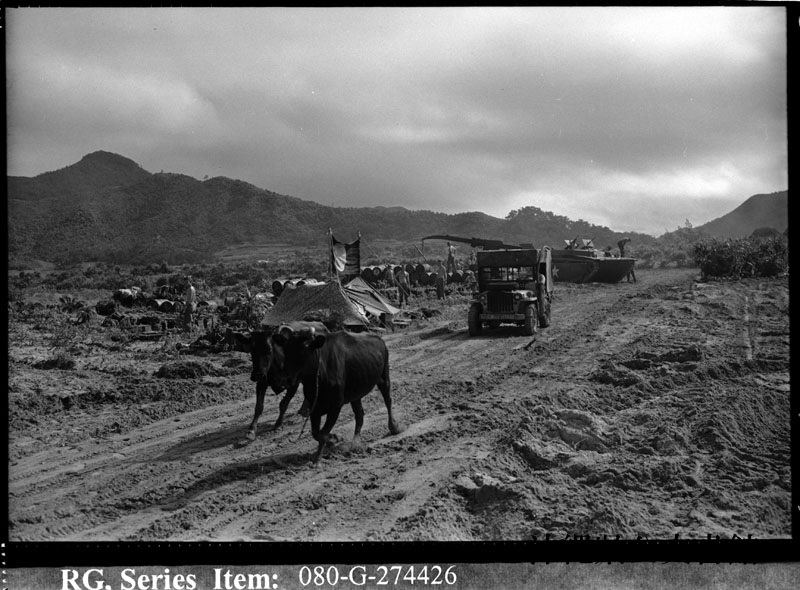 Weasel pushing jeep out of mudhole in road at Iheya Shima, Ryukyu Islands. Looking toward Mae-Dake.【訳】伊平屋島にて、道のぬかるみからジープを押し出そうとしているウィーゼル水陸両用車。前岳を望む。(1945年6月5日撮影)
